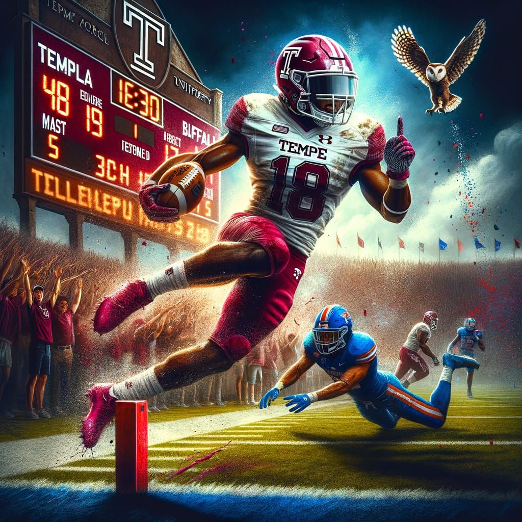 This image shows a Temple University football player scoring a touchdown against Buffalo. The vibrant scene is rendered with dramatic color depth and intricate details in a splash art style. The Temple Owl mascot cheers in the background.
