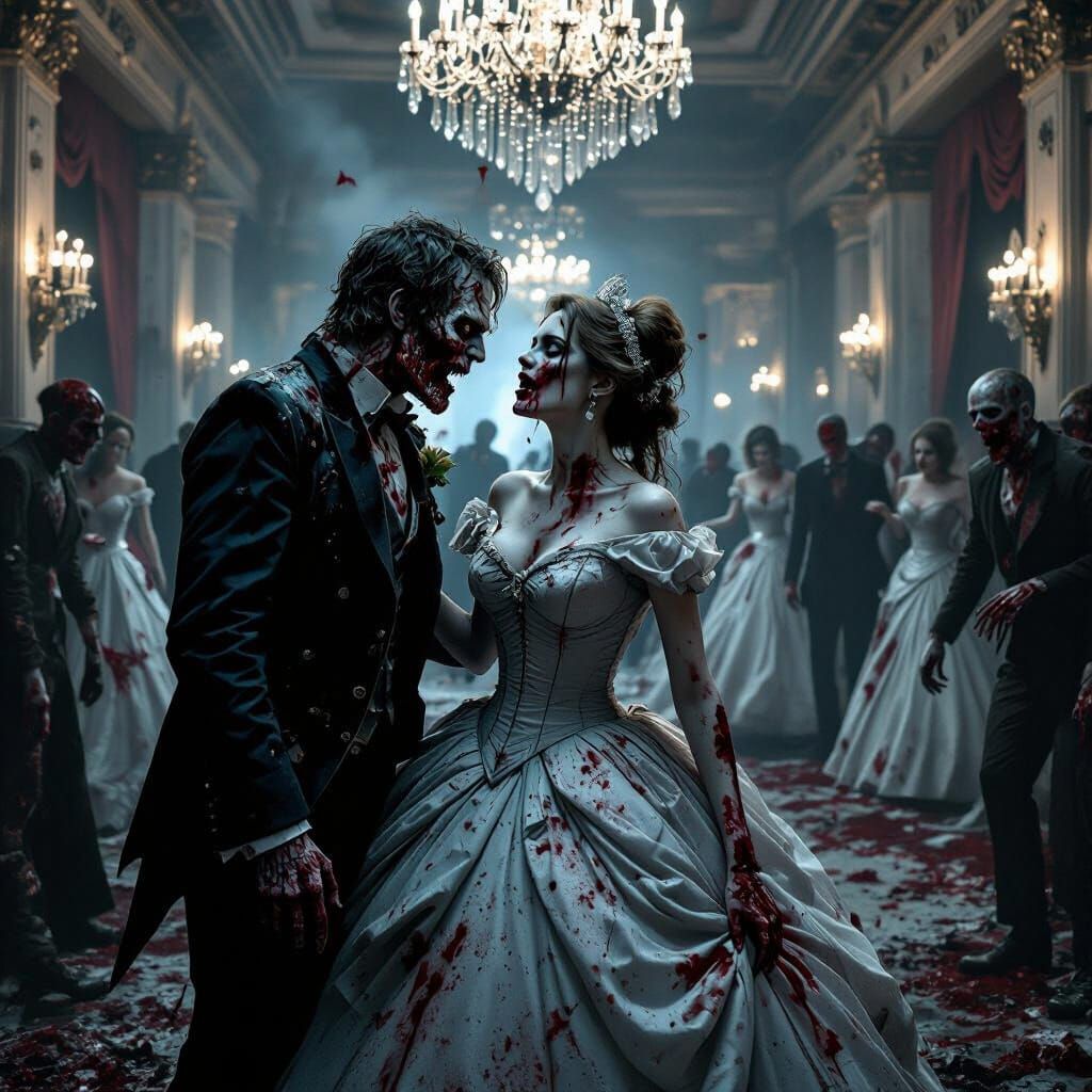 This image depicts a decaying ballroom decorated for New Year's Eve, now overrun by zombies. A chilling scene of gothic horror unfolds with dramatic lighting and a desaturated palette.