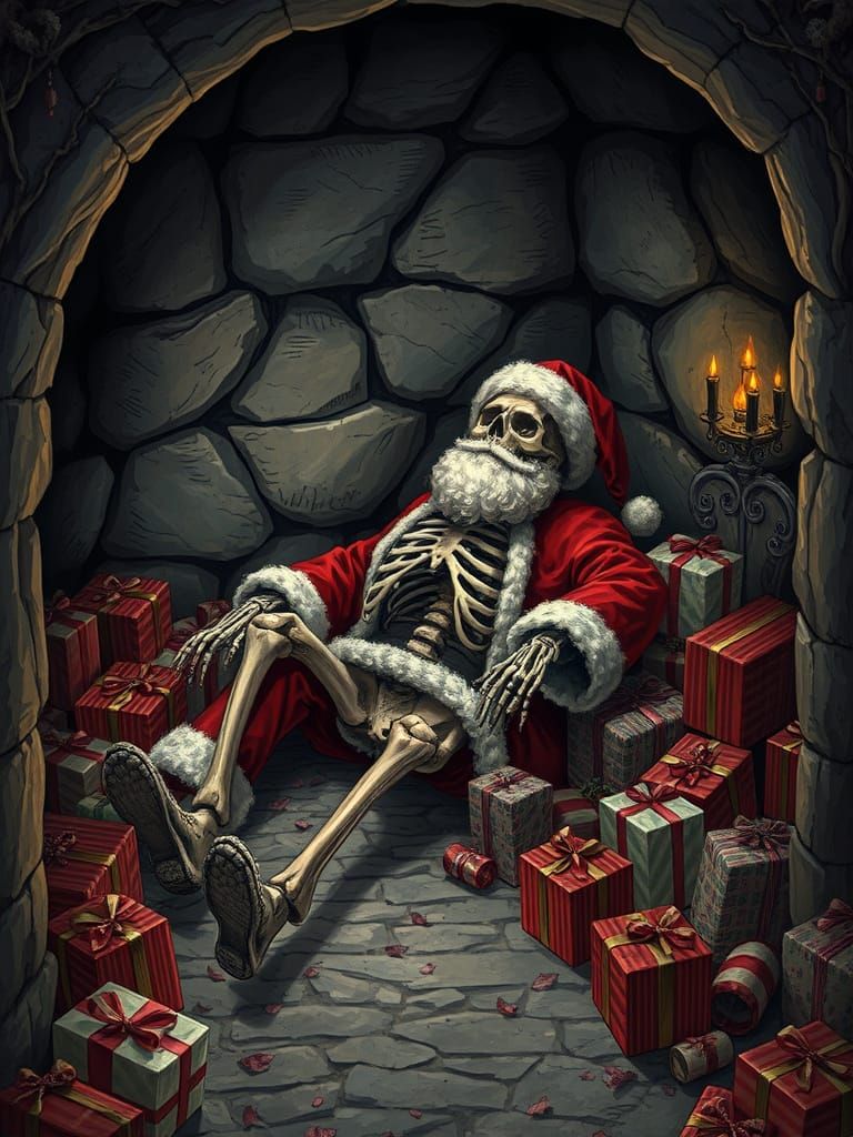 This hyperdetailed gothic artwork shows a skeleton dressed as Santa Claus resting in a crypt, surrounded by numerous scattered Christmas packages.