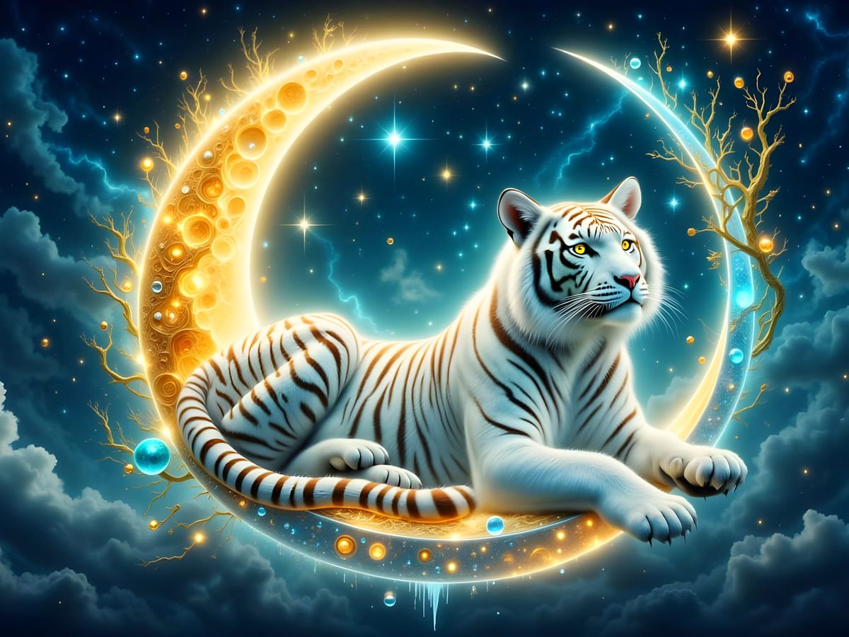 This digital painting shows a majestic white tiger in an elegant pose, lounging beneath a luminous golden half moon. The artwork exudes grace and poise.