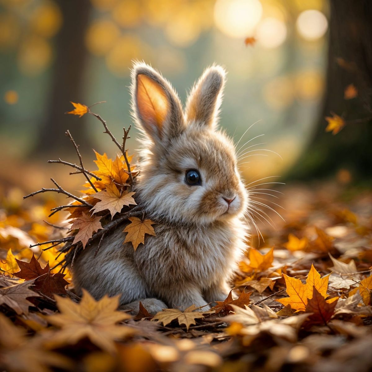 This image shows a shy, fluffy bunny adorned with twig and leaf spikes, nestled amongst fallen autumn leaves. Created in a cozy woodland style with soft, warm, ethereal tones.