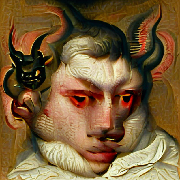 This image depicts a renaissance style portrait of a demon. The artwork captures the textures and color palettes of renaissance painting while depicting the demon.