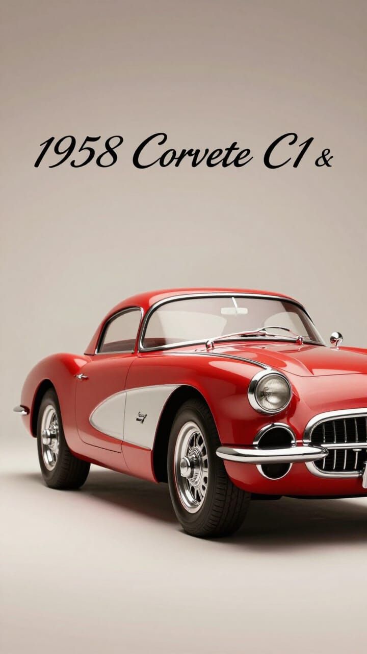 This image features a dynamic studio shot of a red 1958 Chevrolet Corvette C1. Elegant text "1958 Corvette C1" is displayed at the top. Dramatic lighting emphasizes the car's classic design.