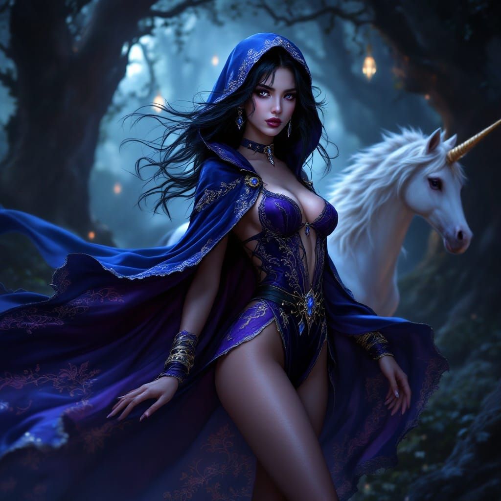 This enchanting image features a raven-haired female Goth Thief, Shiela, standing in a windswept pose, adorned in a richly embroidered purple mini dress and tunic, with delicate bejeweled accents. She's surrounded by a fantastical, dark backdrop, with a subtle white chibi unicorn emerging from the shadow...