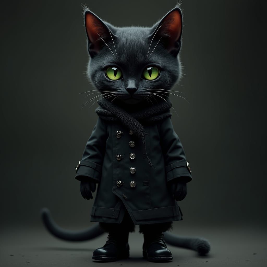 This image shows a photorealistic humanoid black cat standing upright and staring intensely. The cat has sleek fur, vivid green eyes, and wears a dark gothic coat and black leather boots. The image has a cinematic lighting.