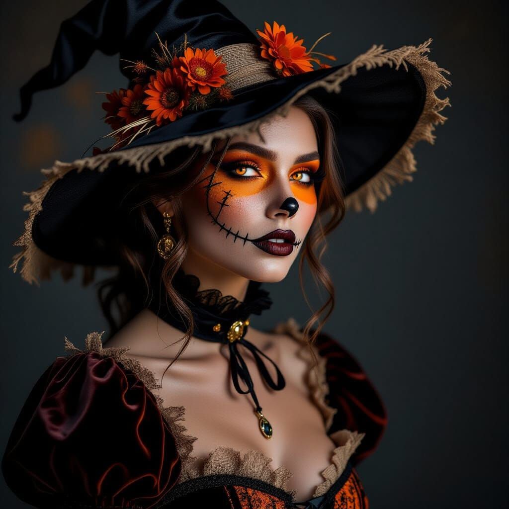 An ultra-photorealistic cinematic portrait of a woman with haute couture scarecrow makeup. Features include chiaroscuro lighting, amber glowing eyes, and a burlap corset dress.
