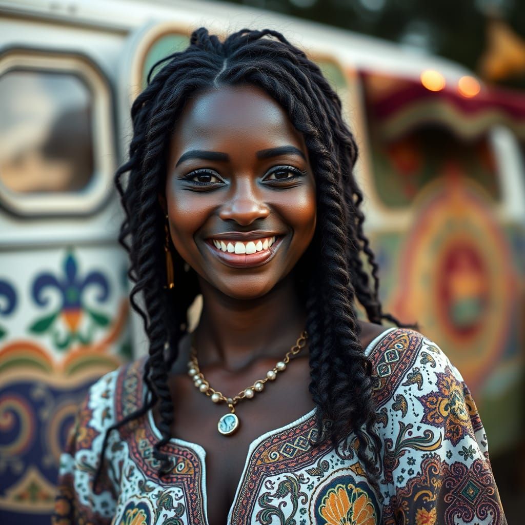 This image shows a smiling, dark-skinned woman in an intricate gypsy dress standing next to a gypsy trailer. The photorealistic image is reminiscent of professional photography with a bokeh effect.