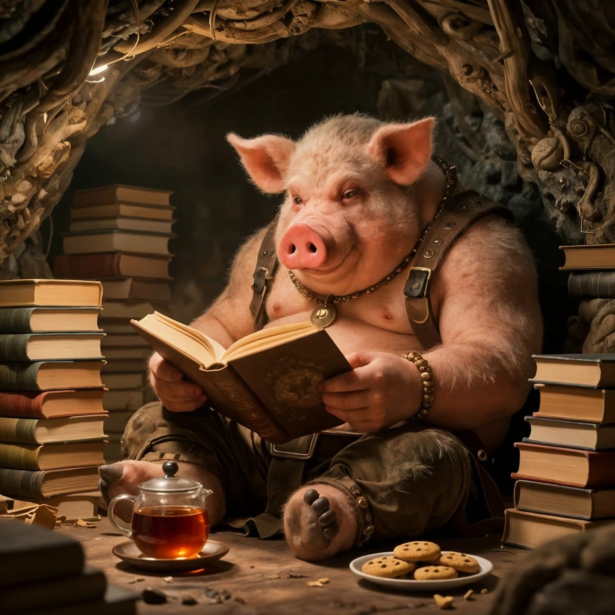 This image shows a detailed illustration of a large ork with a pig snout, absorbed in reading within a book-filled cave. Warm lighting and tea create a cozy atmosphere.