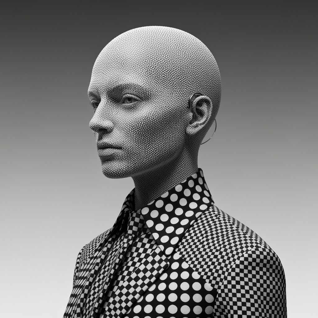 A striking image of a bald figure adorned with white dots and a bold polka dot & checkerboard suit. Captured in high-contrast modern fashion photography.