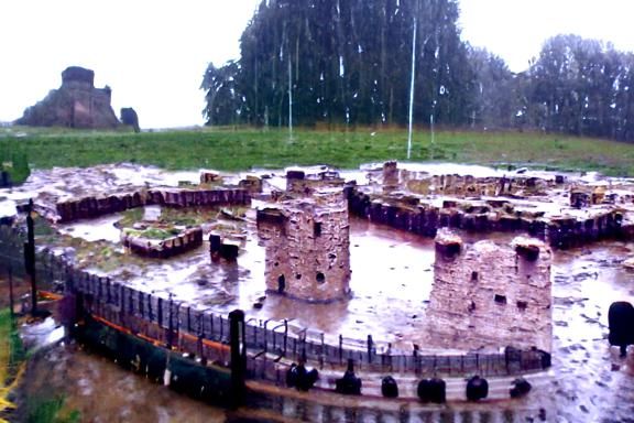 This image shows a Roman castle under heavy rain in Britannia. The architecture reflects Roman engineering combined with the damp climate of ancient Britain.
