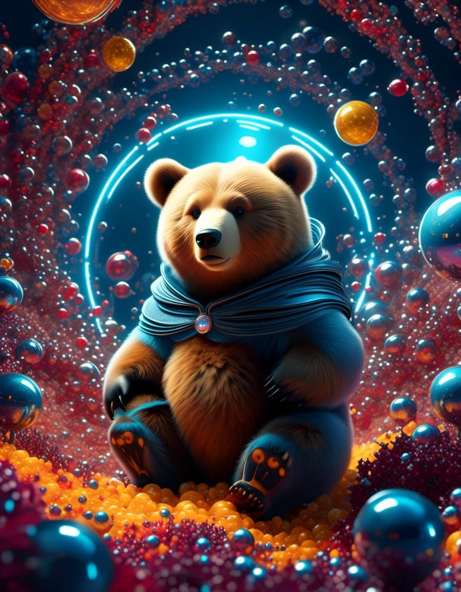 A digital painting of an adorable, chubby bear cub in hyperspace. The image has a surreal, highly detailed aesthetic reminiscent of digital art found on ArtStation and rendered in Unreal Engine 5.