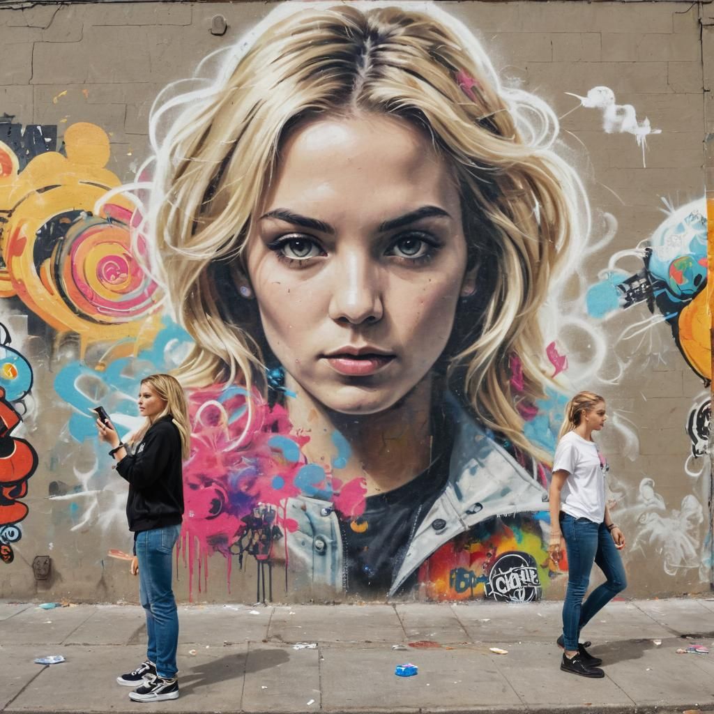 This striking image features a blond woman manager and a football player against a backdrop of urban graffiti. Created in a vibrant, polychromatic oil painting style with pop art elements and dynamic lighting.