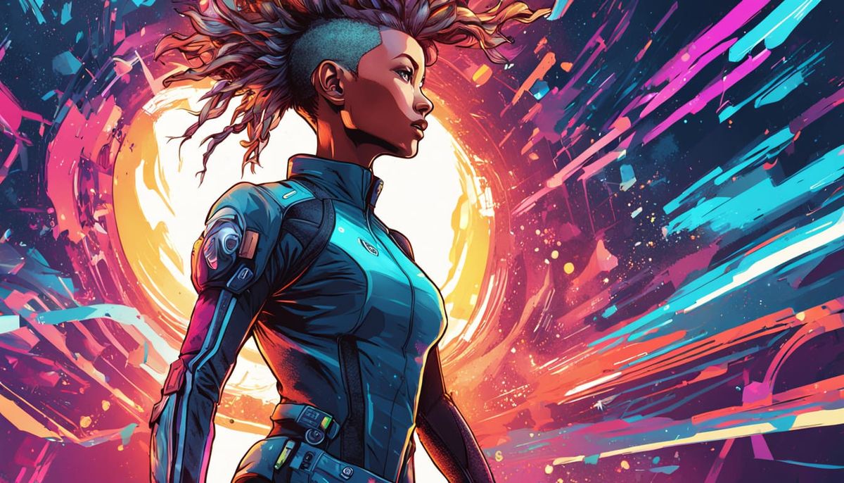 This image shows a confident soccer player with a mohawk on a futuristic field. Neon lights and holographic ads surround her in a cyberpunk aesthetic. The art features vibrant colors and dynamic lighting.