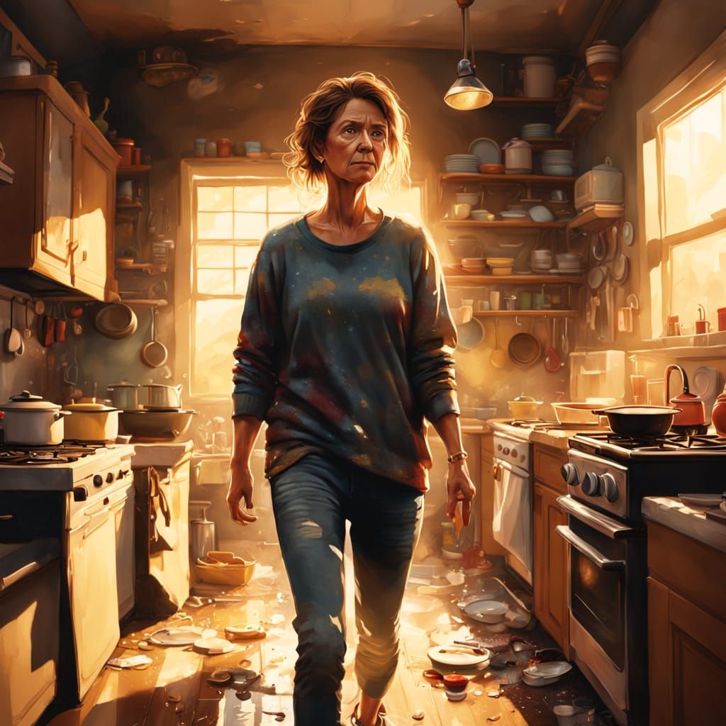 This image shows a mother in a cluttered kitchen filled with dirty dishes and a greasy stove. The style evokes domestic realism with warm lighting and dark shadows, creating a cozy, intimate atmosphere.