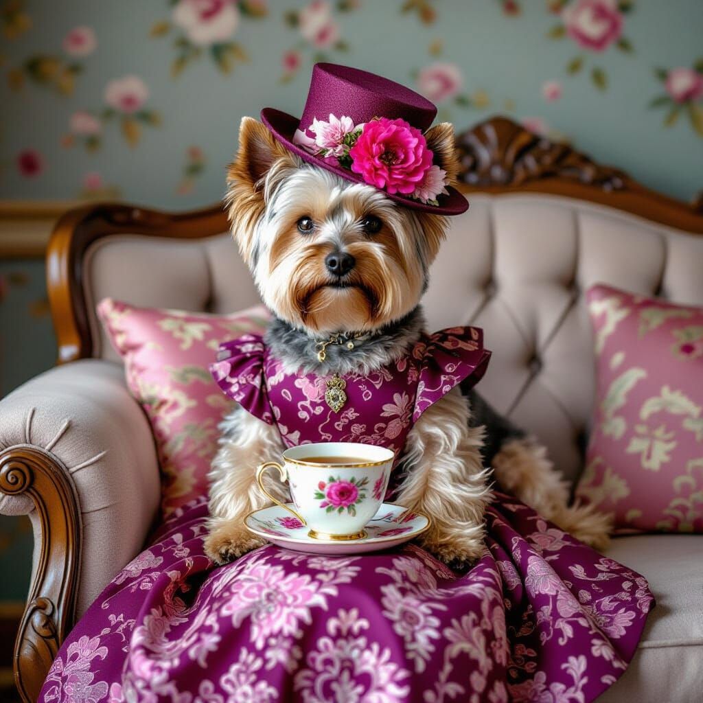 A pink Yorkshire terrier dressed in a paisley outfit and hat sits on a Victorian sofa, sipping tea. This charming scene captures a whimsical, elegant moment.