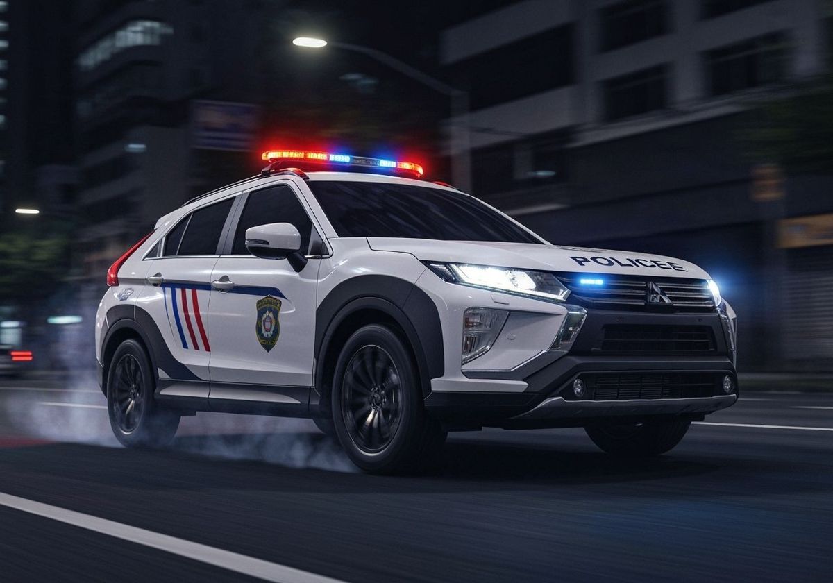 This image shows a Mitsubishi Eclipse Cross as a Brazilian police car speeding through the streets of Sao Paulo at night. The hyperrealistic 8K resolution art features a red and blue strobe light bar.