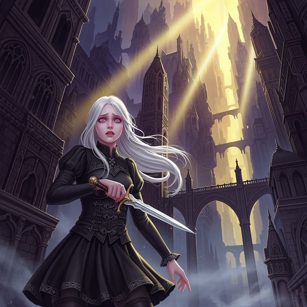A striking picture of an albino woman lost in a gothic city maze, holding a dagger. She is surrounded by towering spires with purple and yellow hues. The image is reminiscent of digital art.