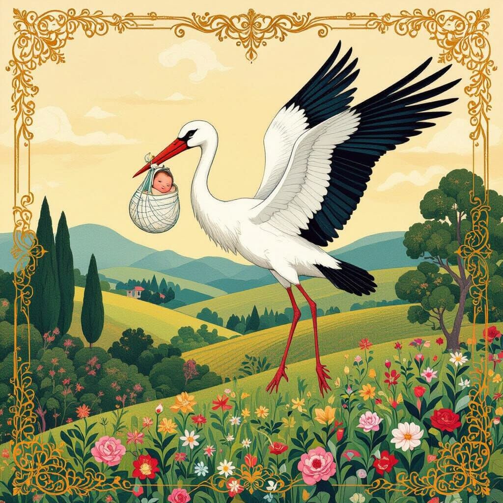 This image shows a stork delivering a baby within a fairytale setting. The scene is presented as an ornate birth certificate, embellished with intricate gold details and a whimsical, illustrative style.