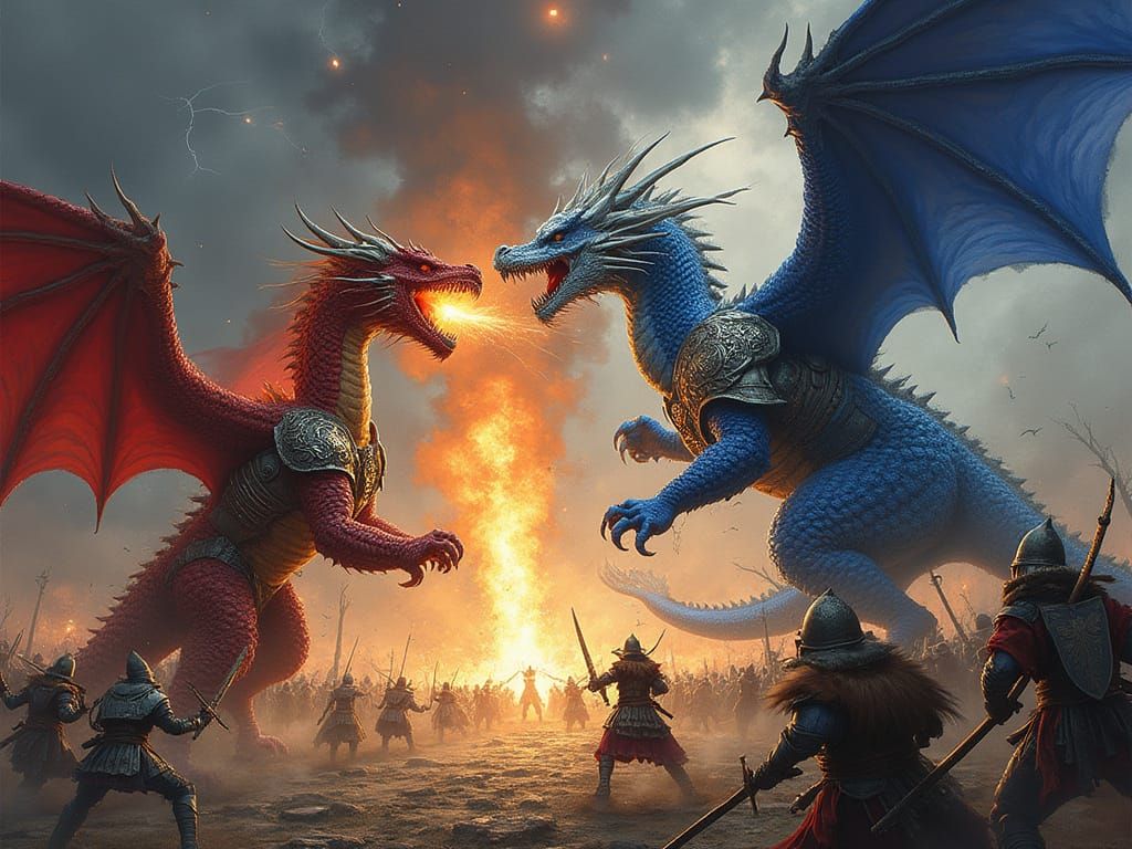 A dynamic scene of three dragons, each in armor inspired by ancient cultures, clash in a frenzy of scales and steel. Viking, knight, and samurai warriors fight alongside their dragon allies on a bloody battlefield, amidst a fire tornado and thunderstorm.