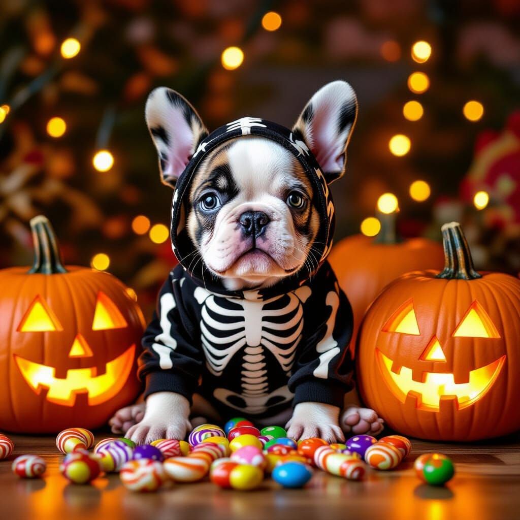 A cute French Bulldog dressed as a skeleton sits with Halloween candy and carved pumpkins, bathed in glowing lights for a festive atmosphere. Illustrated in a vibrant, whimsical style.