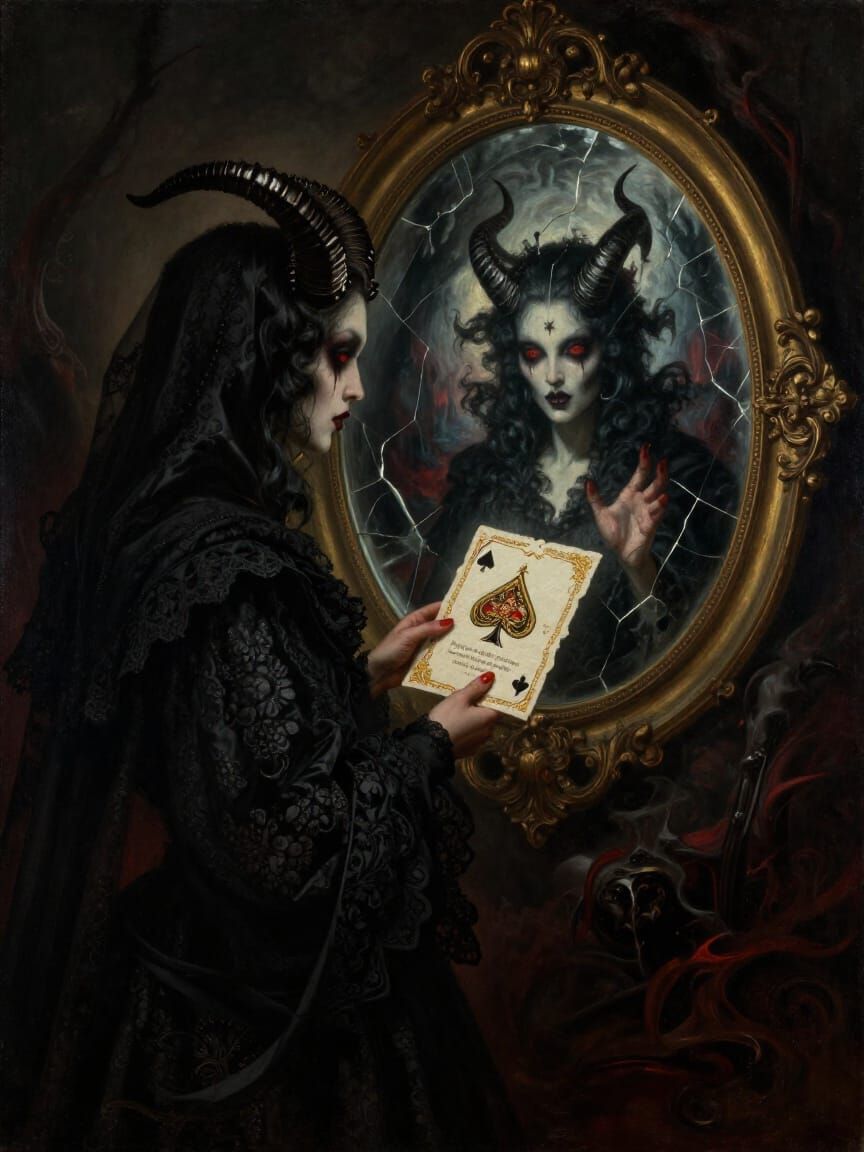 This oil painting depicts a cloaked figure offering a gilded invitation showing the Demon Queen of Spades beckoning from a distorted antique mirror. Dramatic lighting creates a macabre atmosphere with hellish reflections.