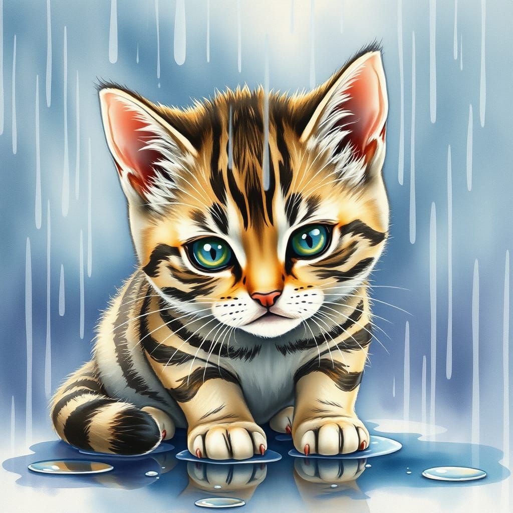 This image is a highly detailed, photorealistic painting of a sad-looking striped kitten in the rain, illuminated by a sunbeam and surrounded by water puddles, evoking a sense of melancholy and nostalgia.