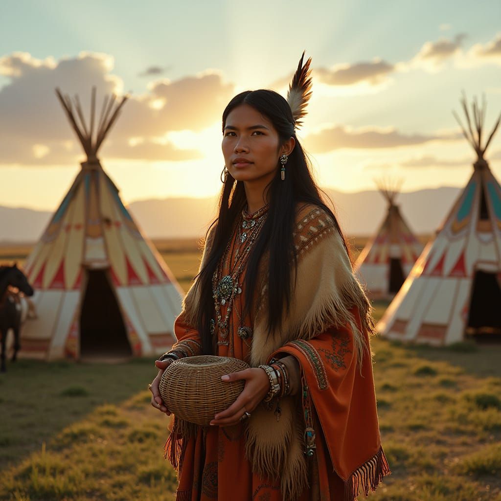 This image depicts a serene Native American woman standing in the center of a peaceful village at sunrise, surrounded by colorful tipis, vast plains, and distant mountains. The warm glow of the morning light illuminates her calm and proud expression, as she holds a woven basket and is surrounded by the g...
