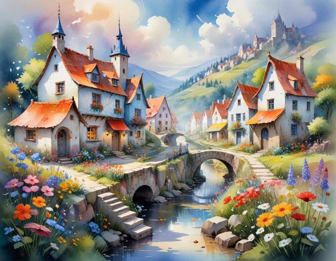 This image shows a whimsical fairy village with colorful houses and wildflower-lined streets. The artwork blends watercolour techniques with a cinematic stylization to achieve a mesmerizing and ethereal effect.