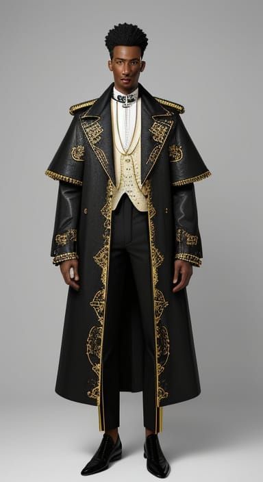 This image shows an African American male model in Afrofuturistic couture. He is wearing a trench coat with Afrocentric embroidery, layered textures, and Victorian-style details, rendered as a pencil sketch.