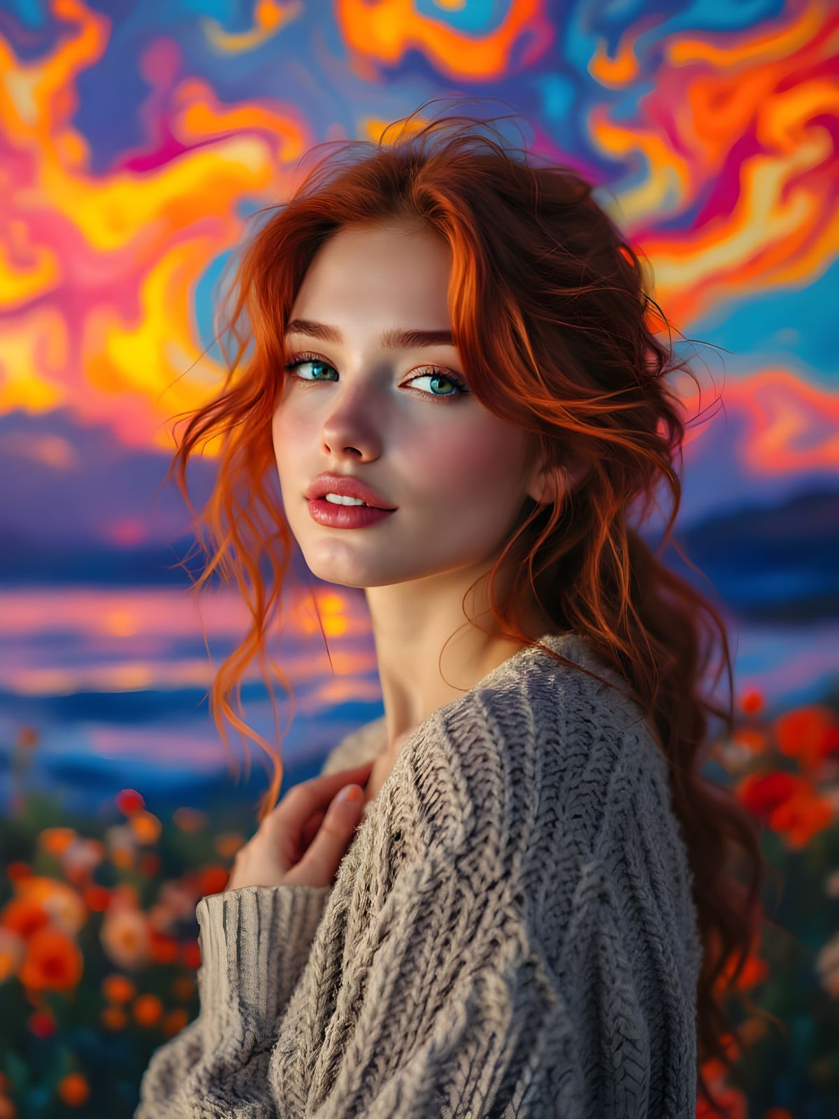 This image features a captivating young Irish woman with red hair, softly lit against a vibrant sunset. The background boasts textured brushstrokes inspired by Van Gogh's style.