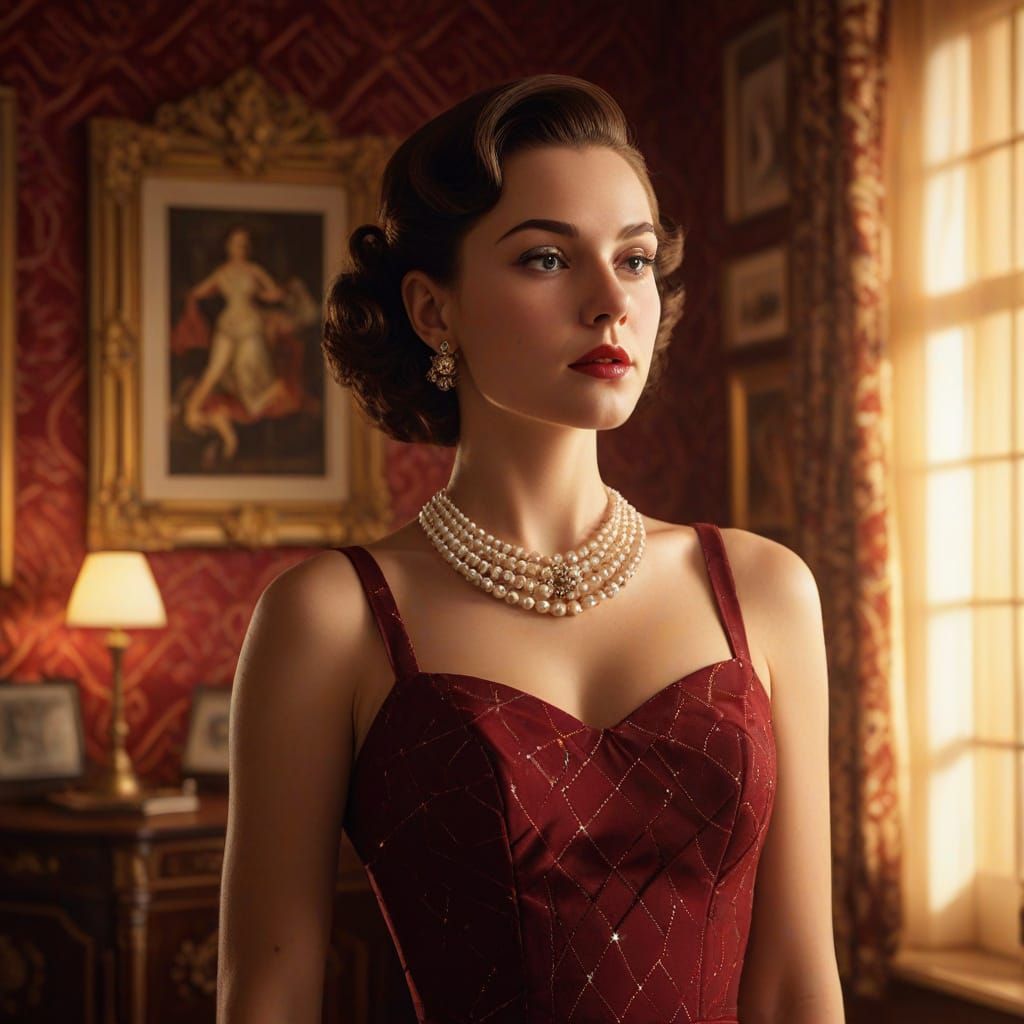 A striking picture of a 1950s Italian pin-up woman in a vintage room. The digital art features Alex Ross style lighting, pearl jewelry, and intricate patterns with warm, cinematic colors.