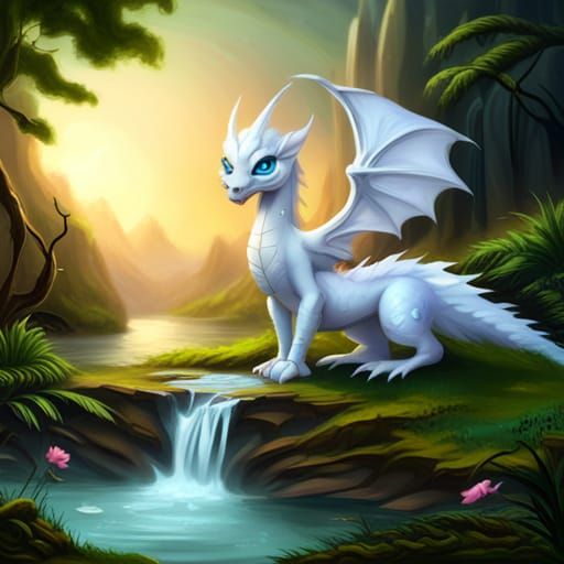 A charming image of a baby white dragon with captivating blue eyes near a serene lake and waterfall. The artwork captures a sense of ethereal beauty.