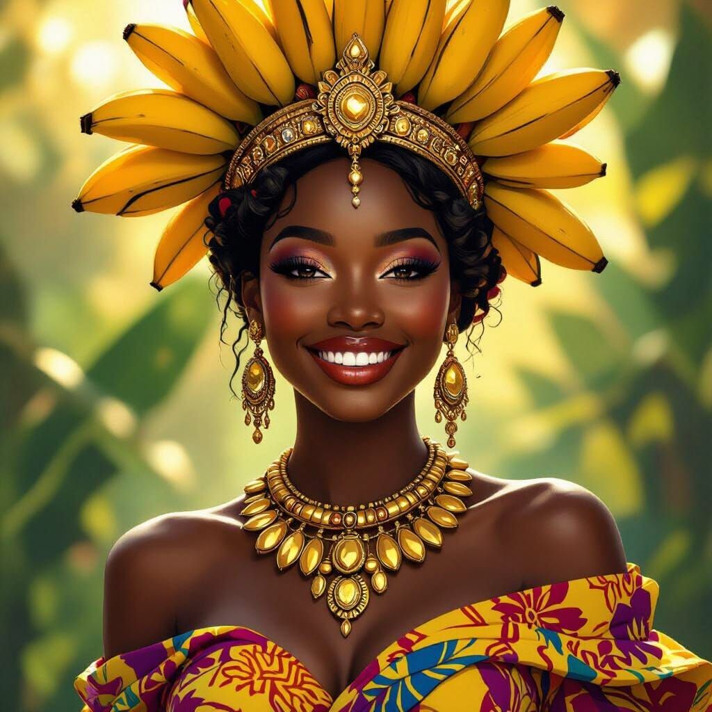 A beautiful African queen adorned with a banana leaf crown and gold ornaments, smiling brightly. Her skin glows under warm sunlight, rendered in a bold digital art style with detailed patterns.