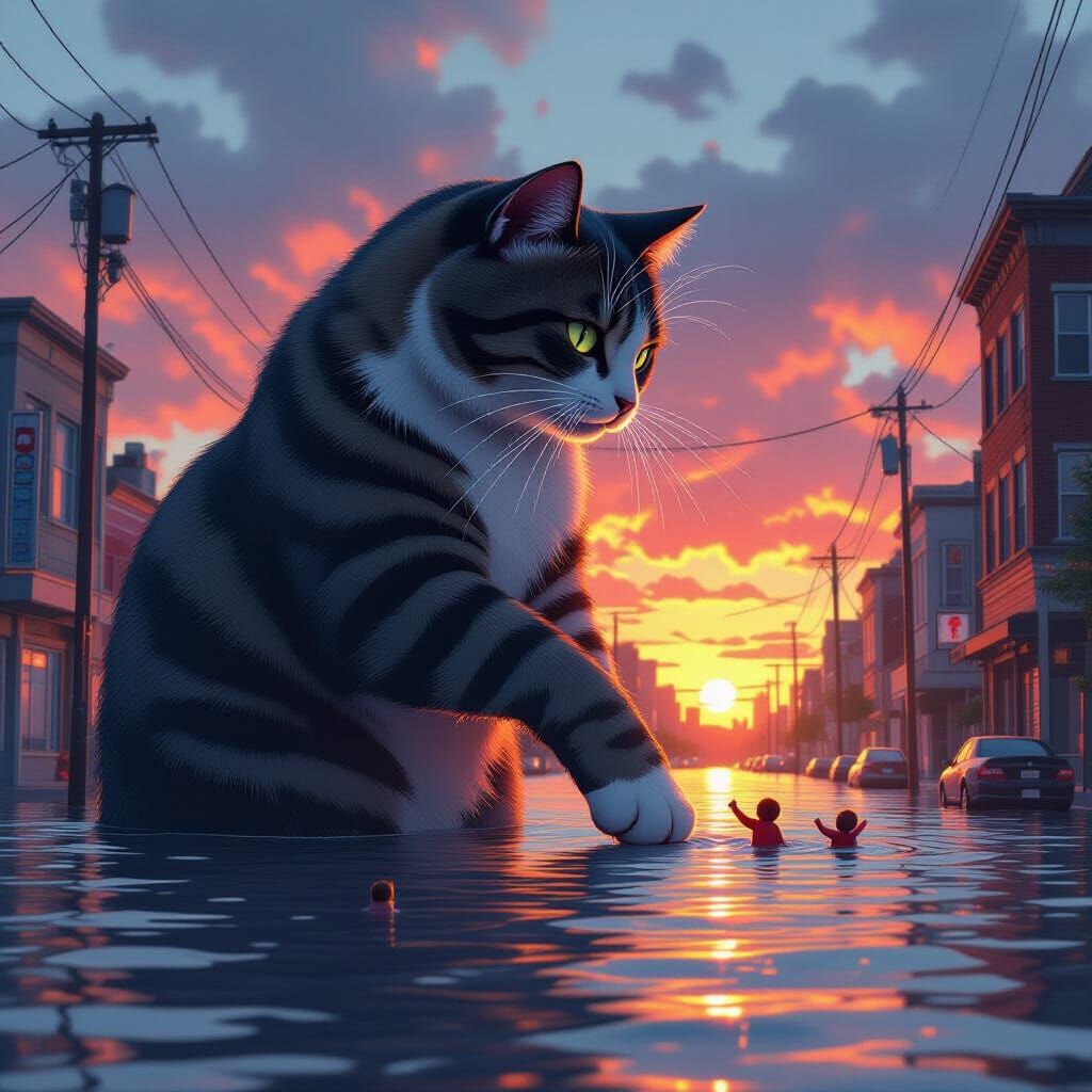 A hyperrealistic image showing a giant cat rescuing people and animals from a flooded city street at sunset. The artwork features intricate details and dramatic colors.