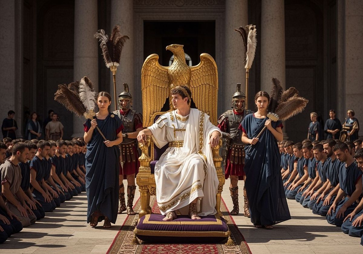 This image shows a Roman Emperor on a golden eagle throne carried by soldiers. Servants with fans accompany him as he passes kneeling peasants, captured in a photorealistic style with natural lighting.