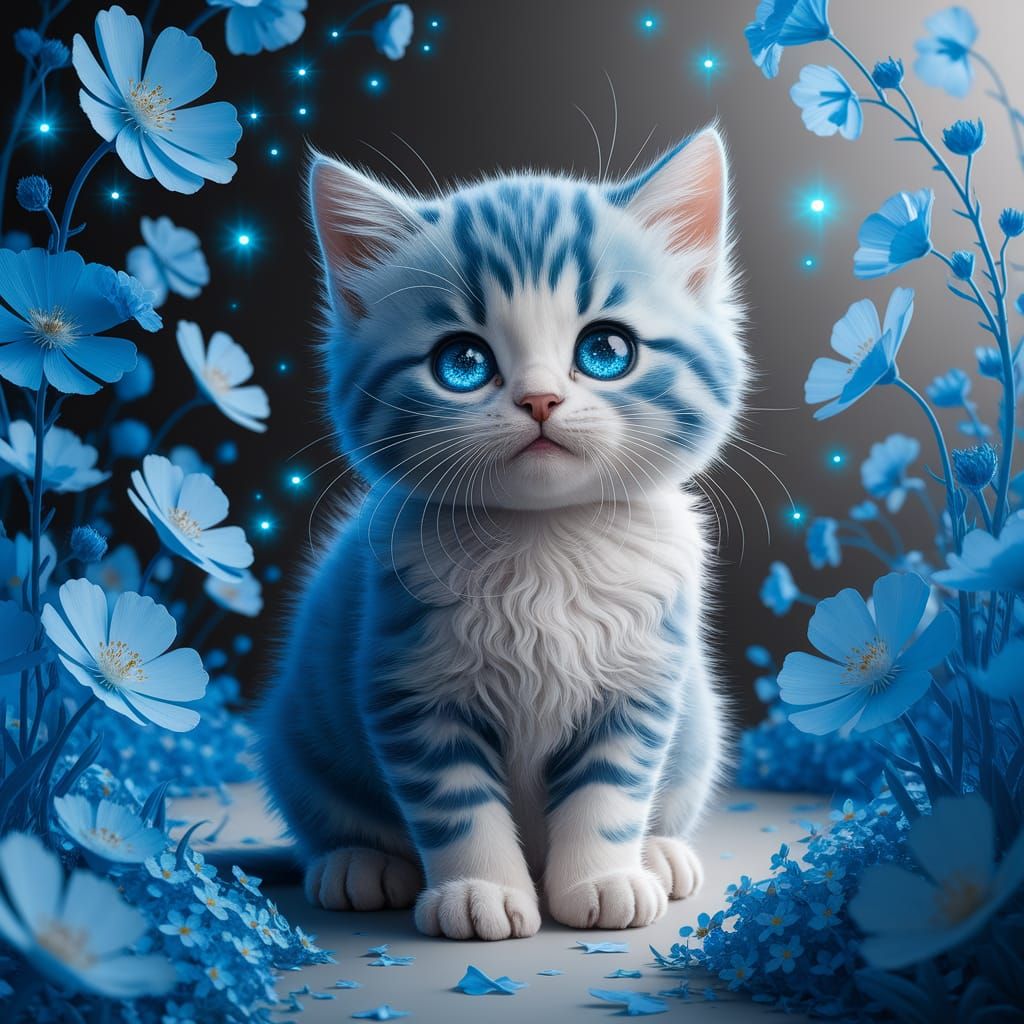 This image shows a cute blue and white kitten with glittery blue eyes, sitting amongst blue flowers. The digital artwork features detailed fur and glowing lights in a magical garden setting.