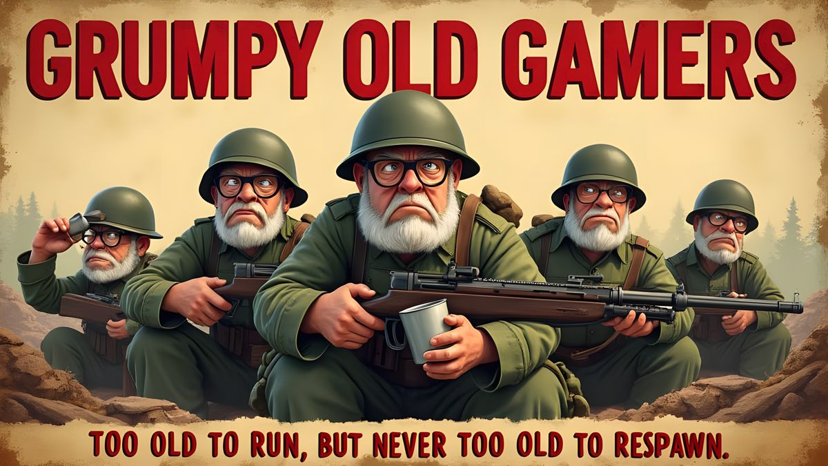 This humorous parody poster features grumpy, gray-bearded soldiers in a WW2 trench. It mimics a vintage 1940s propaganda style with bold colors and exaggerated expressions, perfect for gamers.