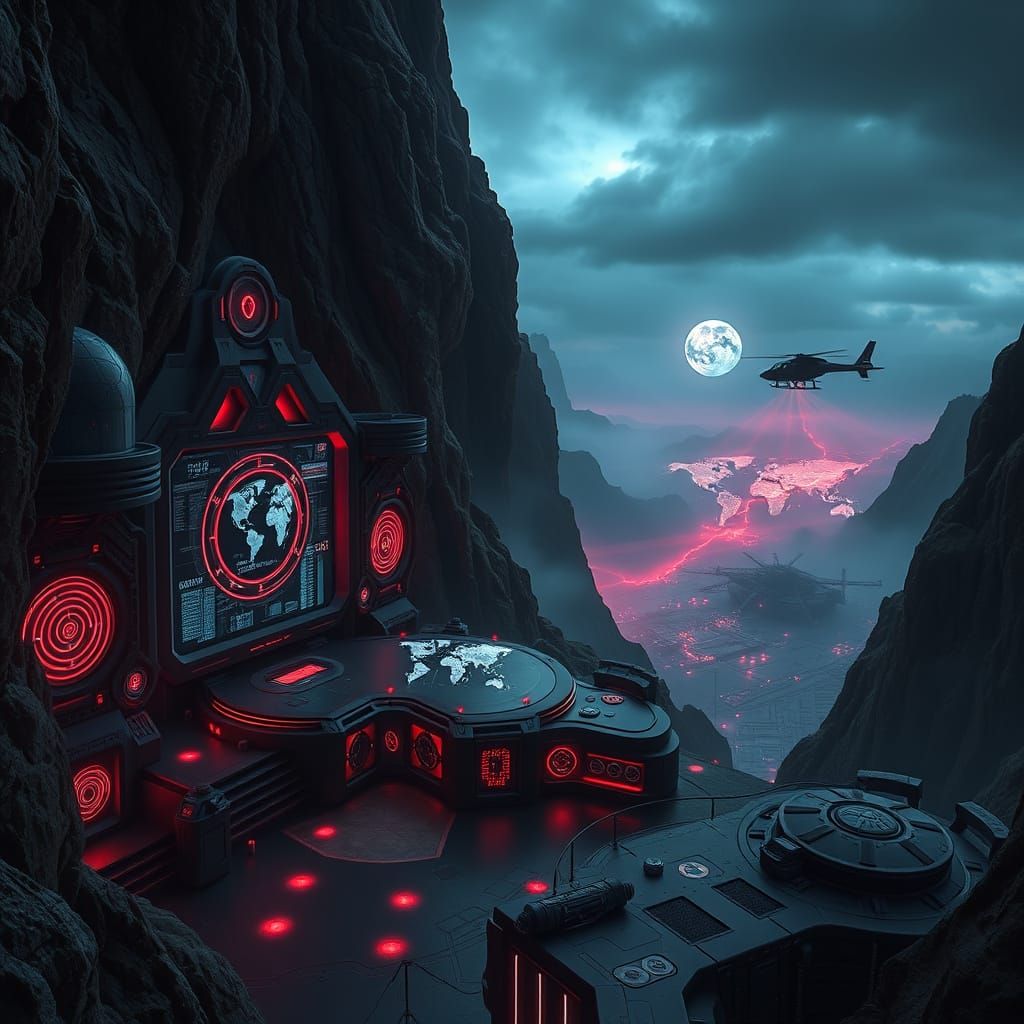 A dark, futuristic supervillain hideout built into jagged cliffs, featuring neon lights, high-tech defenses, and a central control room with a world map. Cinematic concept art.