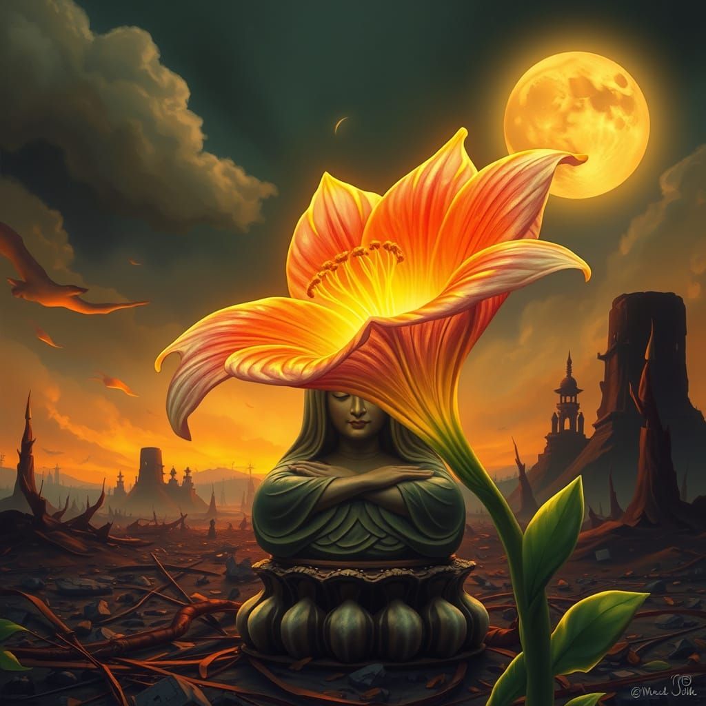 This image shows a radiant lily on a Buddha statue in a war-torn battlefield. The romantic aesthetic features intricate details, soft textures, and vibrant colors, like the works of Alphonse Mucha.