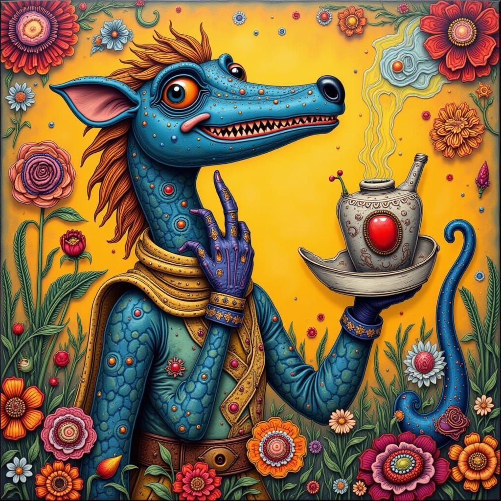 This image is what an AI image generator created when given a very simple prompt about mixing artistic styles and emotions.