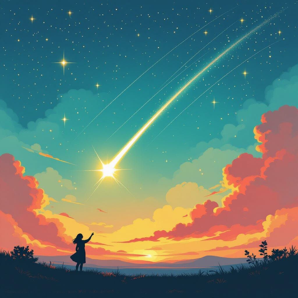 A vivid image of a shooting star over the Aquarius constellation. Gouache textures and a blend of turquoise, yellow, red-violet, and green hues create a dreamy, cinematic feel.