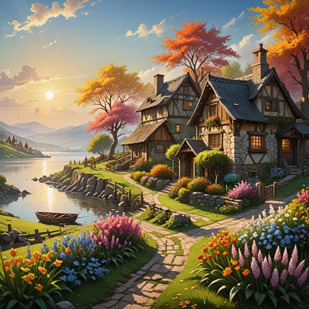 This serene image captures a moment of tranquility as a man and woman walk together by the sea, near a charming village cottage, surrounded by the vibrant colors of spring.
