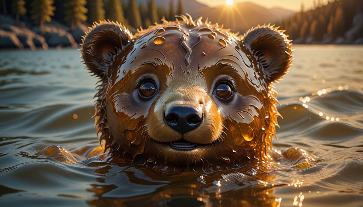 This image shows a charming baby bear joyfully swimming in golden honey. Hyperrealistic textures, lens flare and side lighting add depth to this vibrant digital art.