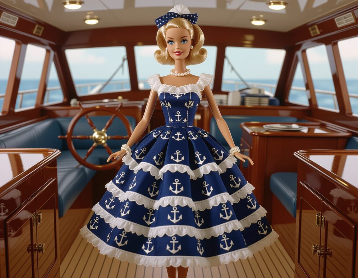 This image shows a Barbie doll in a nautical-themed dress inside a yacht. The artwork evokes the style of mid-century American illustration, with emphasis on nostalgic charm and luxurious details.