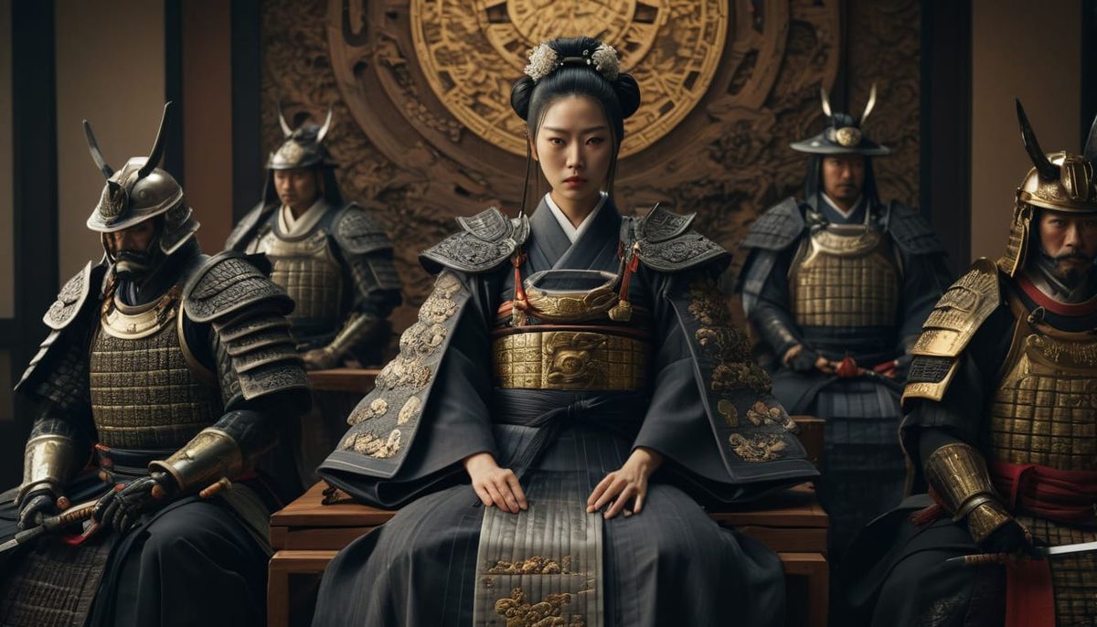 This image depicts a young empress in a serene, photorealistic Japanese throne room setting, surrounded by elegant advisors and samurai, with intricate details and warm lighting, reminiscent of traditional Japanese art.