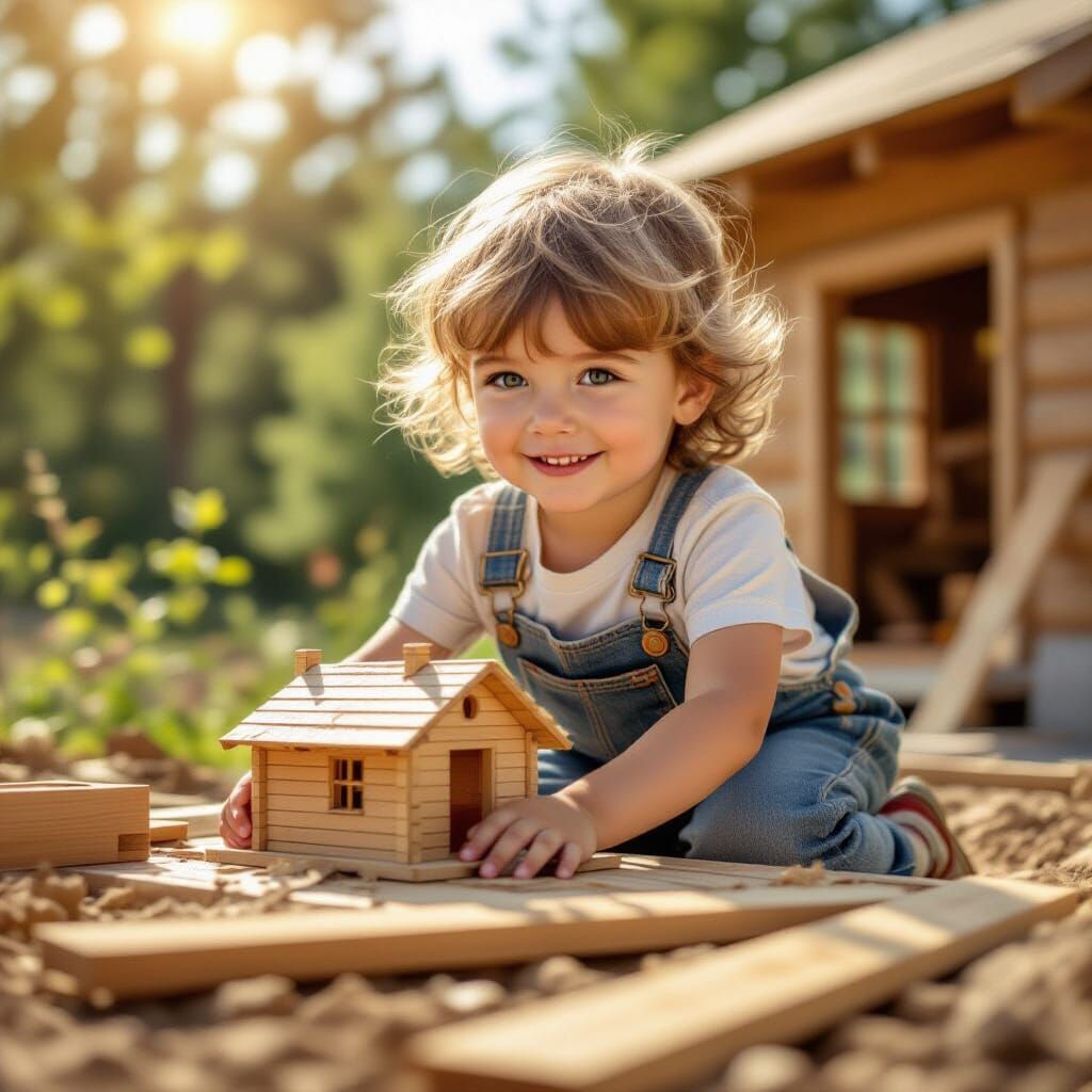 This hyperrealistic image shows a bright child with freckles and red curls assisting with construction on a small wooden house. The scene features warm colors and playful details under natural light.