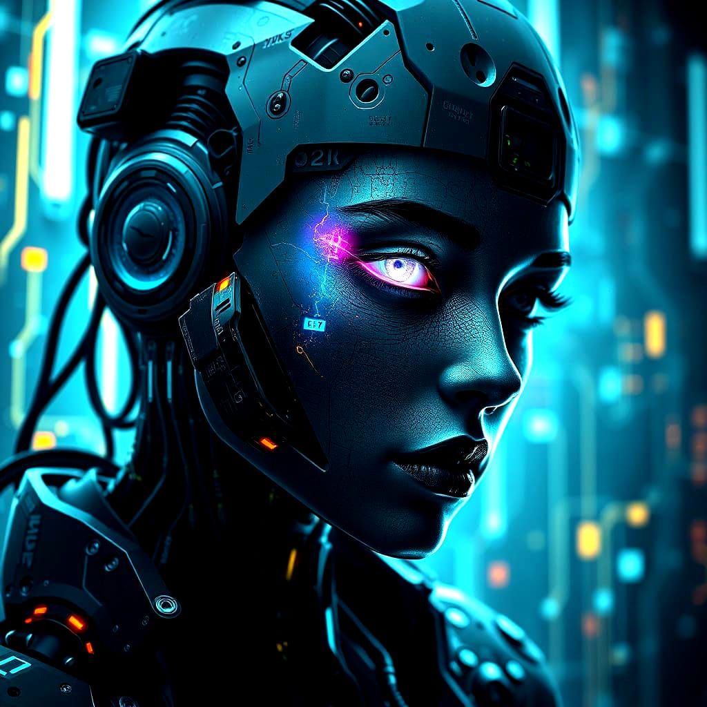 a futuristic cyborg woman, one eye glowing with electric energy, surrounded by glitching blocks and circuitry, dark and mysterious, high contrast, intricate detail, sci-fi, cyberpunk, Flux style, dynamic lighting, depth of field, 8k resolution, digital art