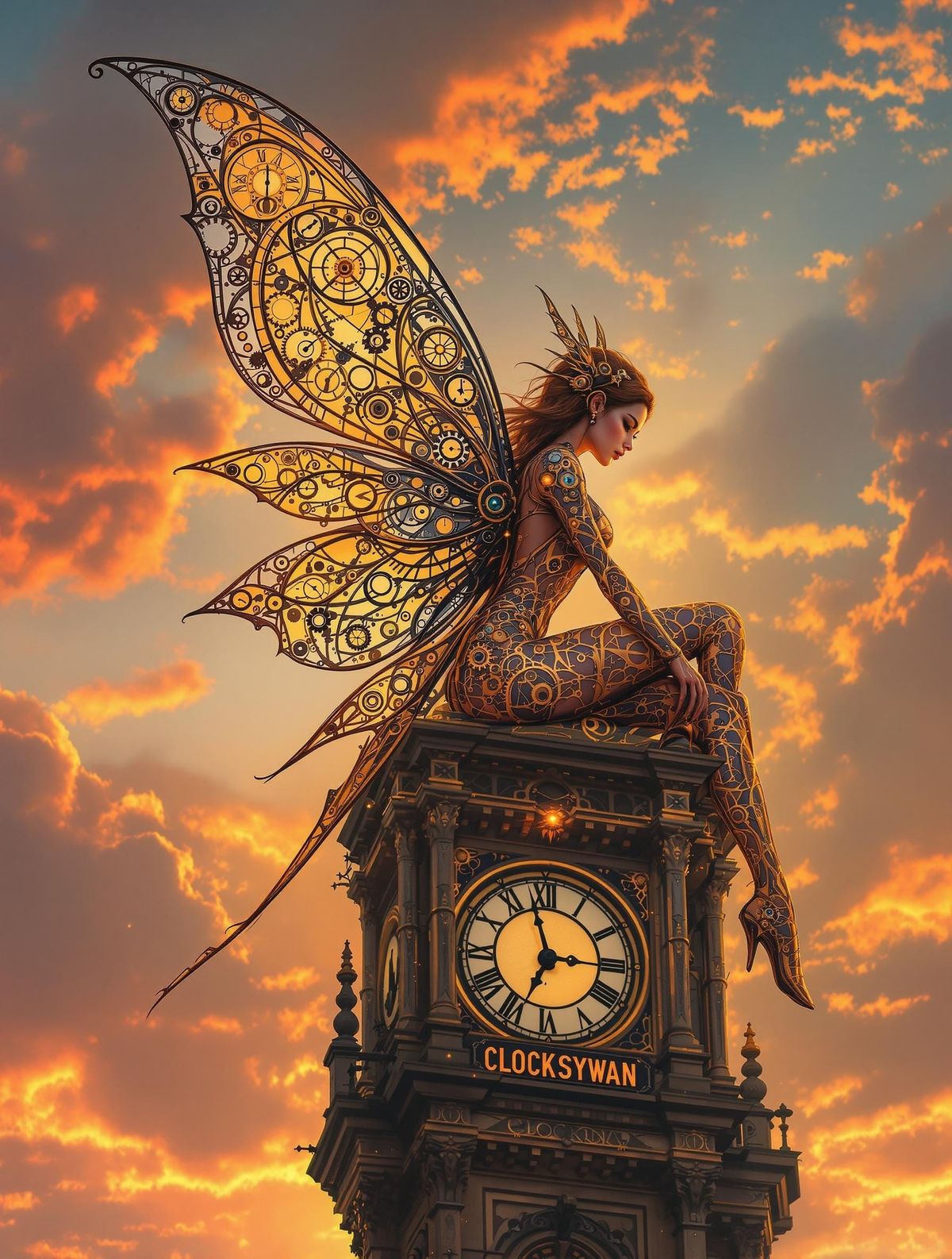 A striking picture of a steampunk fairy perched on a clocktower. Intricately engraved mechanical wings shimmer in the sunset, reflecting warm gold and bronze tones. The artwork emphasizes storytelling through gears and filigree.