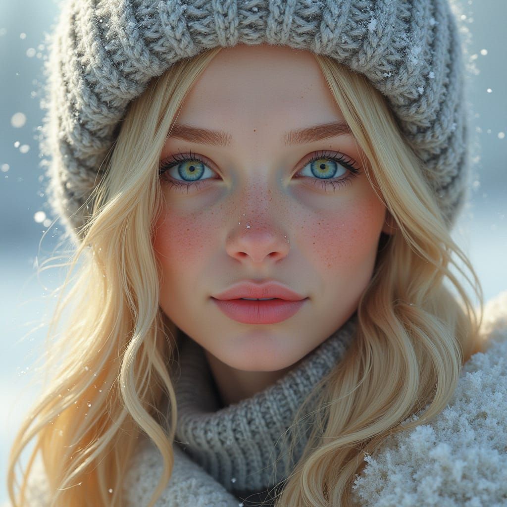 A highly detailed pencil sketch of a glamorous woman with blonde hair and blue-green eyes. The portrait captures her enigmatic smile in a snowy landscape with dramatic lighting.