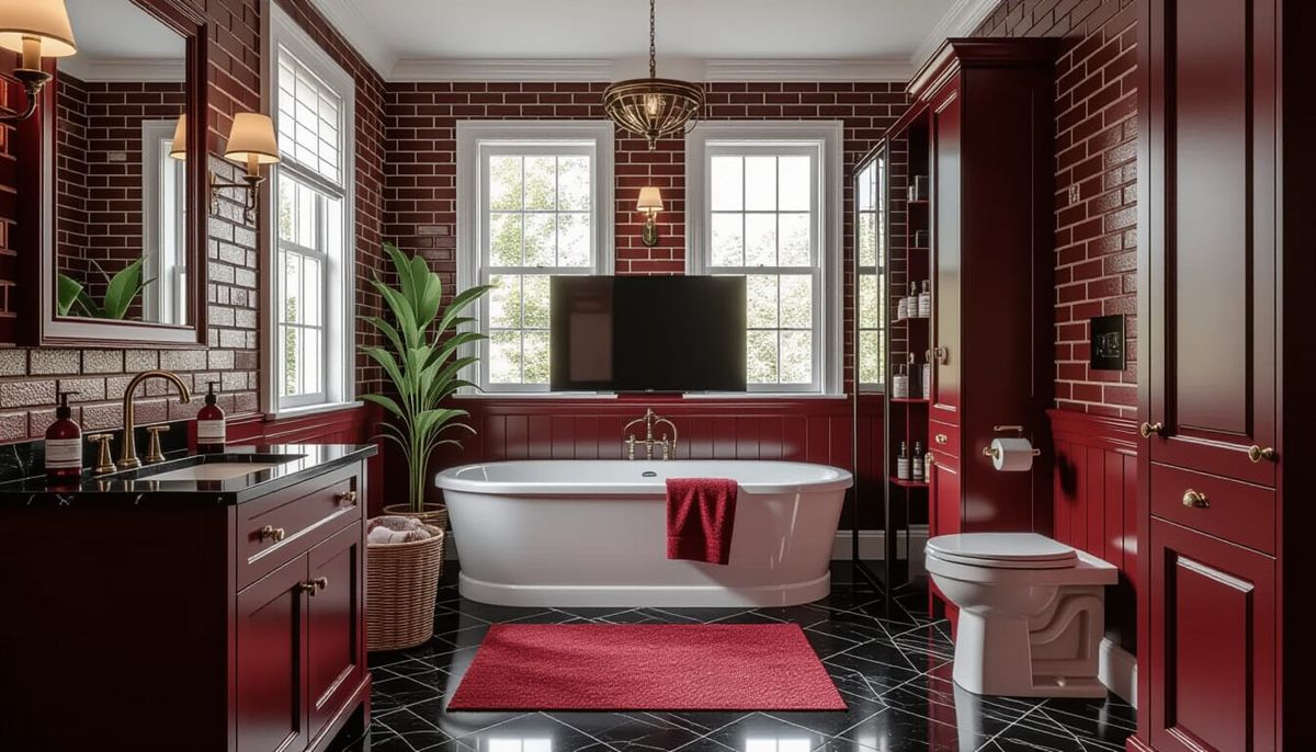 This image shows a charming Victorian bathroom in a wide-angle, cinematic style. It features brick wallpaper, dark red cabinets, black marble floors, and dramatic lighting for a photorealistic look.